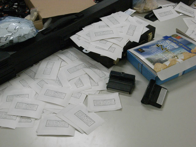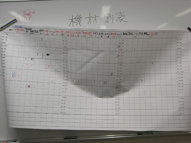 だれがどの機材を使うか、合計何個使うかなどが分かるように用意した、機材割表も埋まってきました。幅180cm×高さ90cm くらいの大きさがあります。見える化ですね。